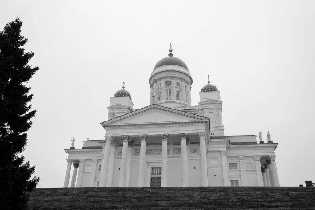 Pour aller dans le centre, nous prenons le tram. Ils ont l’air d’avoir de l’âge et nous font penser à de vieux trains soviétiques. De manière générale, Helsinki nous a fait pensé à la Russie, bien que nous n’y ayons jamais mis les pieds. Les trams, les gens, l’architecture et les vieux ascenseurs à grilles… On descend place du Sénat où le marché de Noël est en train d’être monté. L’imposante Cathédrale Luthérienne surplombe la place et nous invite à y jeter un oeil. On peut noter le bel orgue qu’elle contient. On repart vers le parc de l’esplanade où se tient un petit marché de Noël puis on passe devant la statue Havis Amanda. On arrive aux halles couvertes, très belles. Nous essayons de faire des photos mais le temps est brumeux. De plus, il fait très froid.