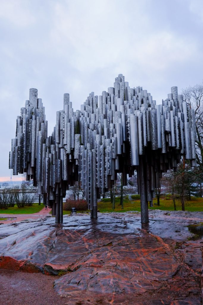 Pour le déjeuner, on mange chez Putte’s bar & pizza. 1 pizza, un buffet de salade et un café pour 10€ par personne ! C’est bon et l’ambiance est sympa. Repus, nous prenons ensuite le tram jusqu’au parc Sibeliuska, un peu excentré de la ville. On se perd dans les lignes de bus mais de gentils finlandais nous viennent en aide. On arrive au pied de la sculpture Sibelius du parc juste avant la tombée de la nuit. C’est un assemblage de tubes en métal qui fait penser à des orgues basaltiques, après quelques photos et être tombés sur un magasin qui porte notre nom, nous reprenons le tram vers le centre ville.