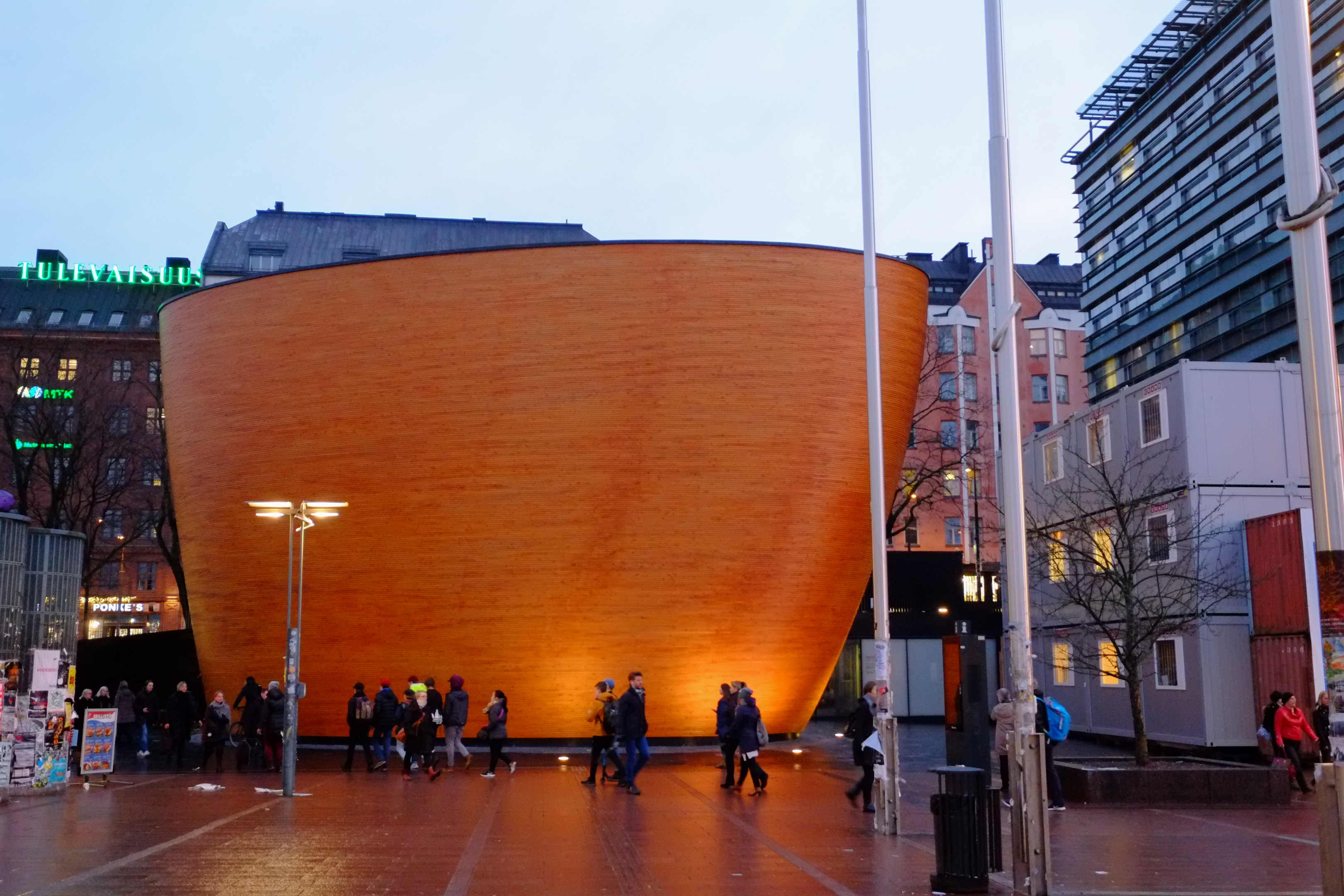 On fait quelques photos de la gare et ces grandes statues qui l’encadrent puis allons voir la chapelle silencieuse de Kampi. D’extérieur, elle ressemble à une coquille de noix ou à l’arche de Noë. Située en plein cœur de la ville, près d’un grand centre commercial, elle ne paye pas de mine. Et pourtant, quelle surprise en rentrant à l’intérieur ! Pas le moindre bruit ! La forme de la chapelle lui permet d’absorber tous les bruits extérieurs. Nous ne restons pas longtemps pour ne pas perturber les fidèles qui n’apprécient guère les touristes curieux.