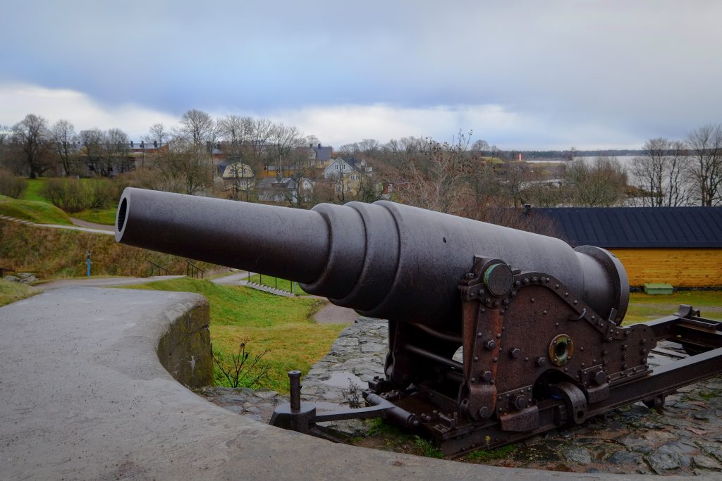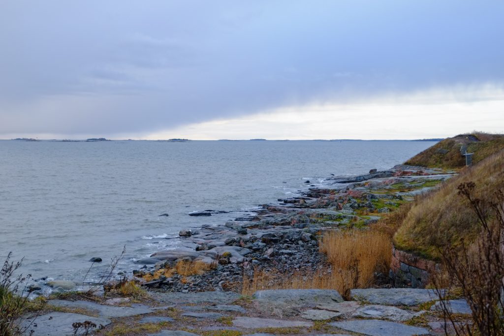 Aujourd’hui, on part sur la petite île de Suomenlinna face à Helsinki. Le ticket du ferry est compris dans le pass métro de la capitale. La traversée dure environ 20 minutes. Sur l’île, il fait très froid et la pluie arrive. Pas de quoi gâcher notre découverte. On se promène entre le fort, les canons, et les fortifications que l’on trouve tout au long de la côte. On passe devant un sous-marin (qui se visite l’été), une église-phare (unique!!) et un musée que nous n’avons pas visité. L’ambiance est assez étrange sur cette île déserte surtout avec ce temps d’hiver, c’est un mélange entre glauque et mystère… Avant de repartir, nous faisons une pause déjeuner près de la caserne rose, au Déli & Café. C’est bon marché et copieux. Pâtes au saumon, ragoût de bœuf, café et cookie pour 27 euros. Nous reprenons le ferry vers Helsinki au coucher du soleil, donc vers 15h30 !