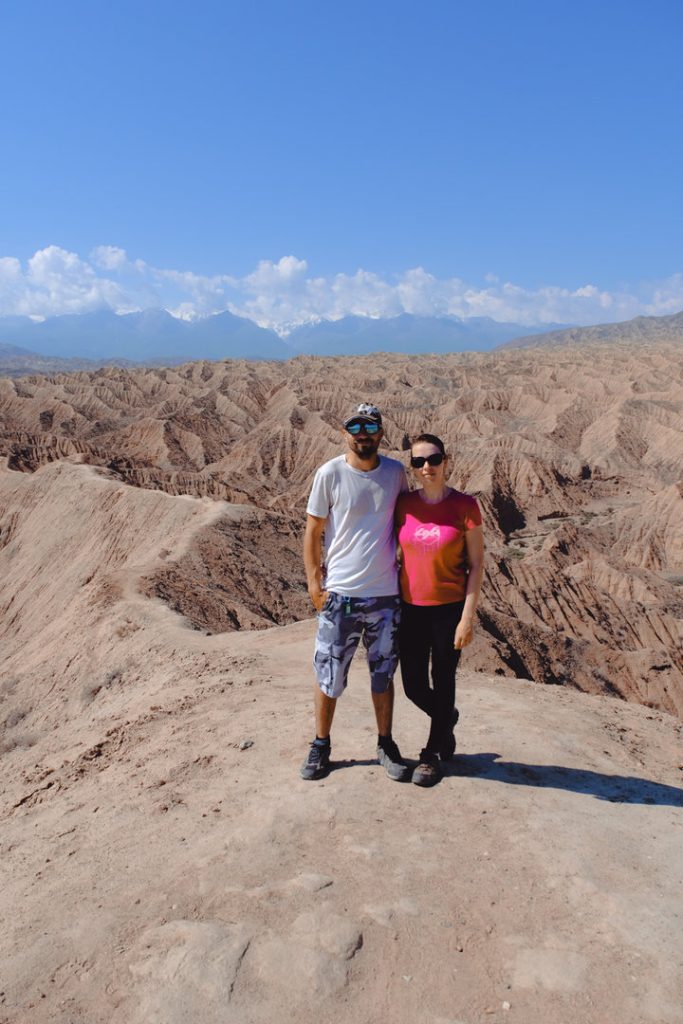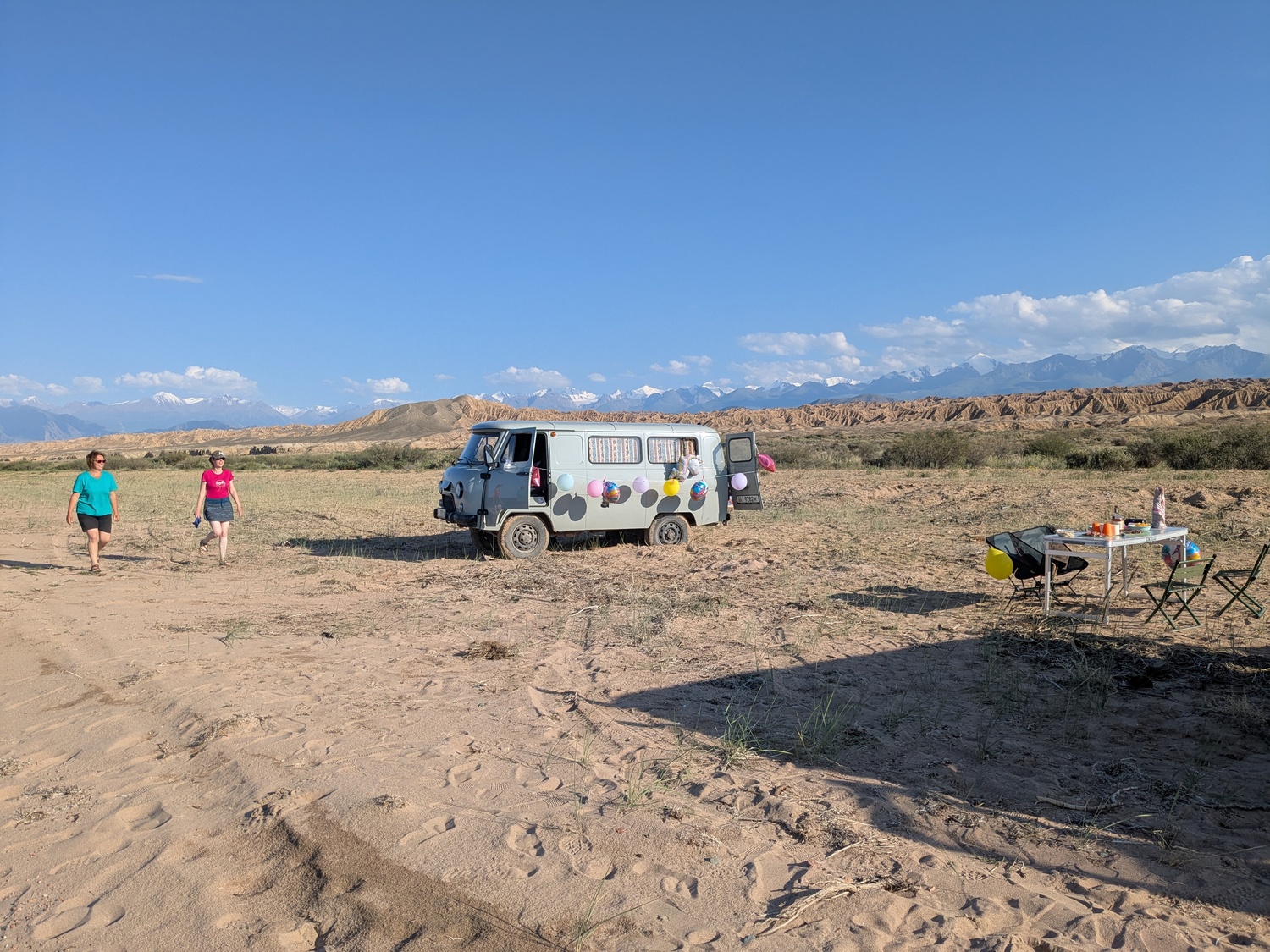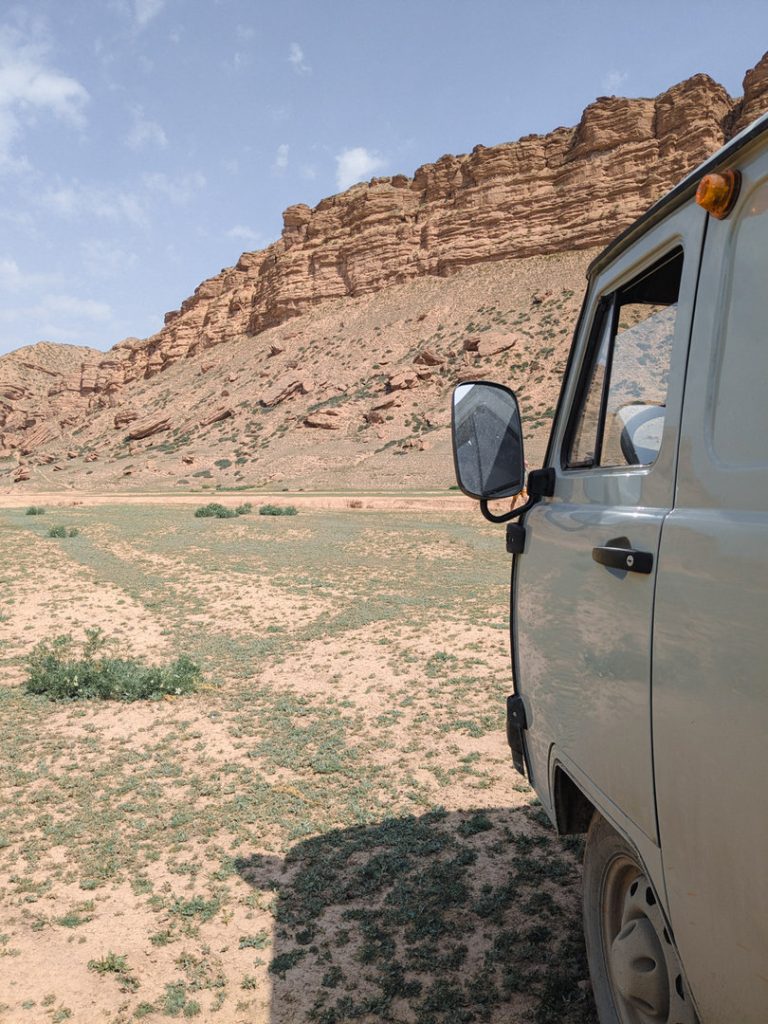 Nous rejoignons le départ de la piste n°4, direction le lac salé de Tuz Kul. On paye 150 soms par personne pour l’entrée du parc. Le lac en lui même est petit mais il aurait des vertus médicinales, notamment les maladies de peaux. Aujourd’hui il n’y a pas grand monde mais le week-end, ça doit être bondé ! Nous passons notre route. La piste est sublime : d’un coté le lac, au milieu des petites dunes, et de l’autre côté un paysage désertique avec un canyon au fond… un décor brut et silencieux. Il paraît qu’on peut y croiser des dromadaires. Certaines zones sont techniques, mais les vaillants UAZ peuvent franchir presque tout — même des passages d’oueds, des pistes sableuses ou un canyon éboulé ! La piste n°4 est vraiment très sympa à faire.