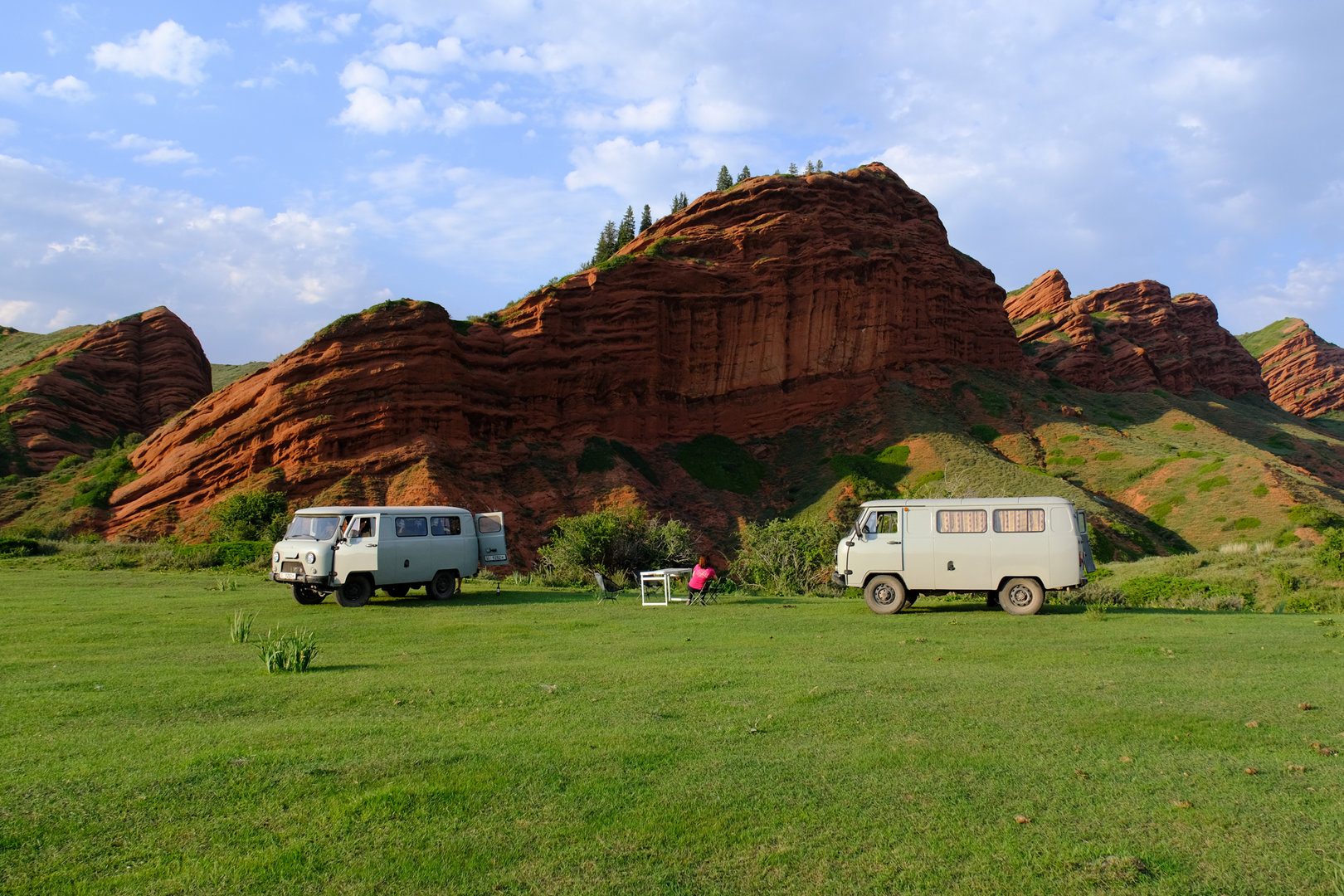 Après les premiers jours de découverte du Kirghizistan et un trek à cheval de 3 jours, nous continuons notre voyage à bord de 2 UAZ en location.