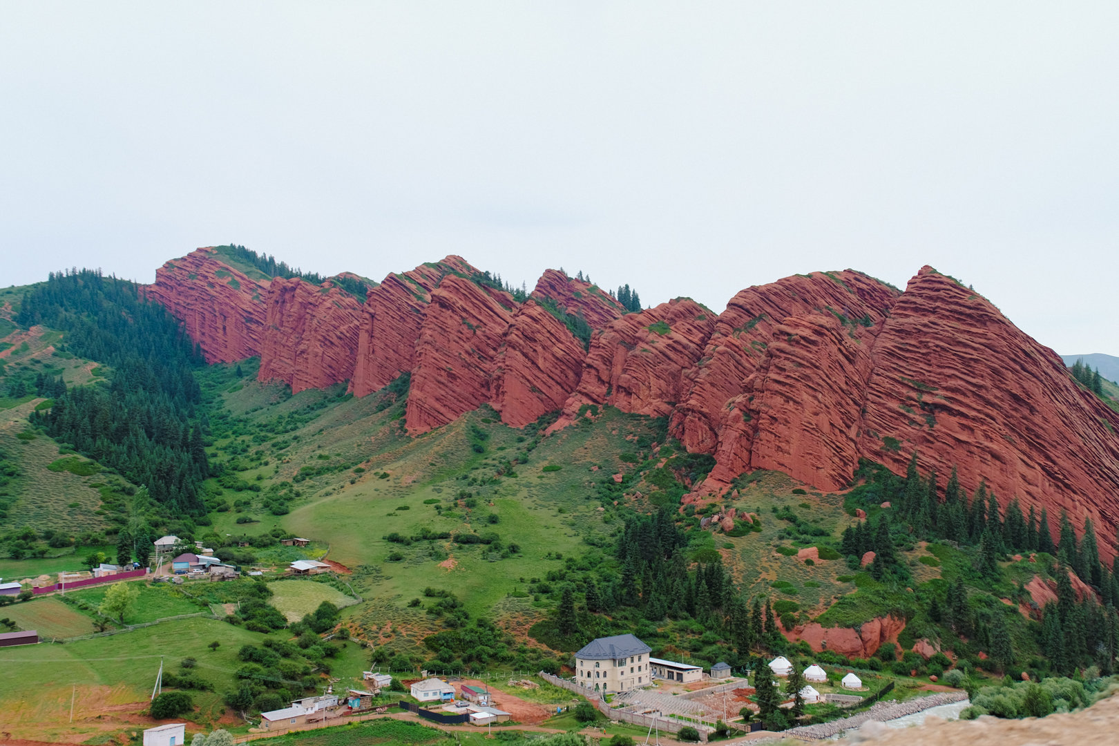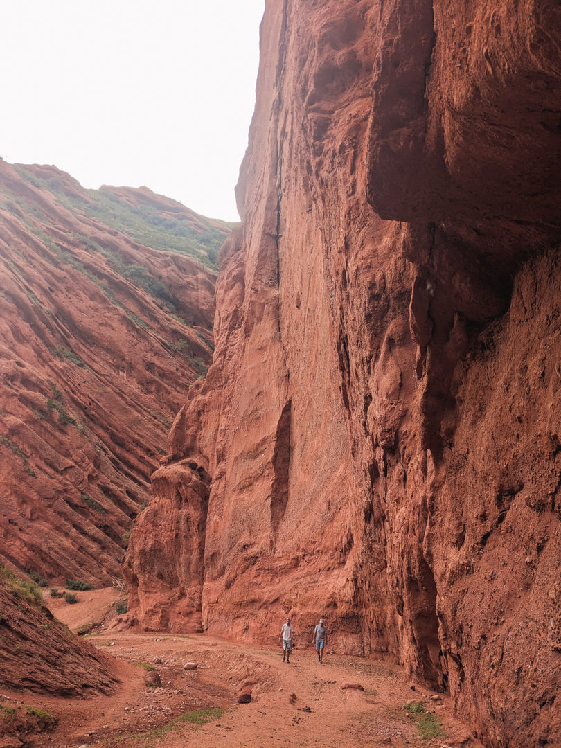 Après un pique-nique et un plein d’essence, nous prenons la route vers Jeti-Ögüz, célèbre pour sa falaise des Sept Taureaux. D’un côté, les roches rouges se dressent comme des statues géantes et de l’autre côté de la route, il est possible de s’enfoncer dans un canyon aux parois immenses. Nous faisons une petite balade dans cet endroit impressionnant. En montant jusqu’en haut, il y a un point de vue pour observer le panorama. Une terrasse et des bâtiments sont en construction… ça gâchera sûrement le paysage à l’avenir.