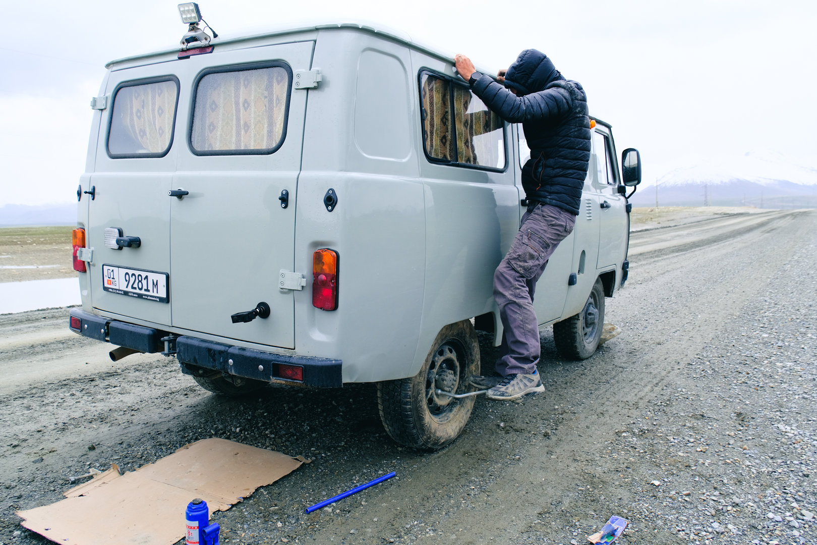 Pour réparer notre panne énigmatique de l’avant-veille, Vlad de l’agence de location, nous donne le contact d’un garagiste à Karakol. Azamat, qui ne parle pas anglais, change la pompe à carburant (que nous avions dans le coffre de l’UAZ)… mais il n’a pas l’air sûr du diagnostic. Après quelques échanges avec Google Trad, il finit par condamner le réservoir n°2. C’est l’agence de location qui paye l’intervention.