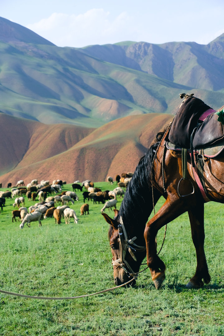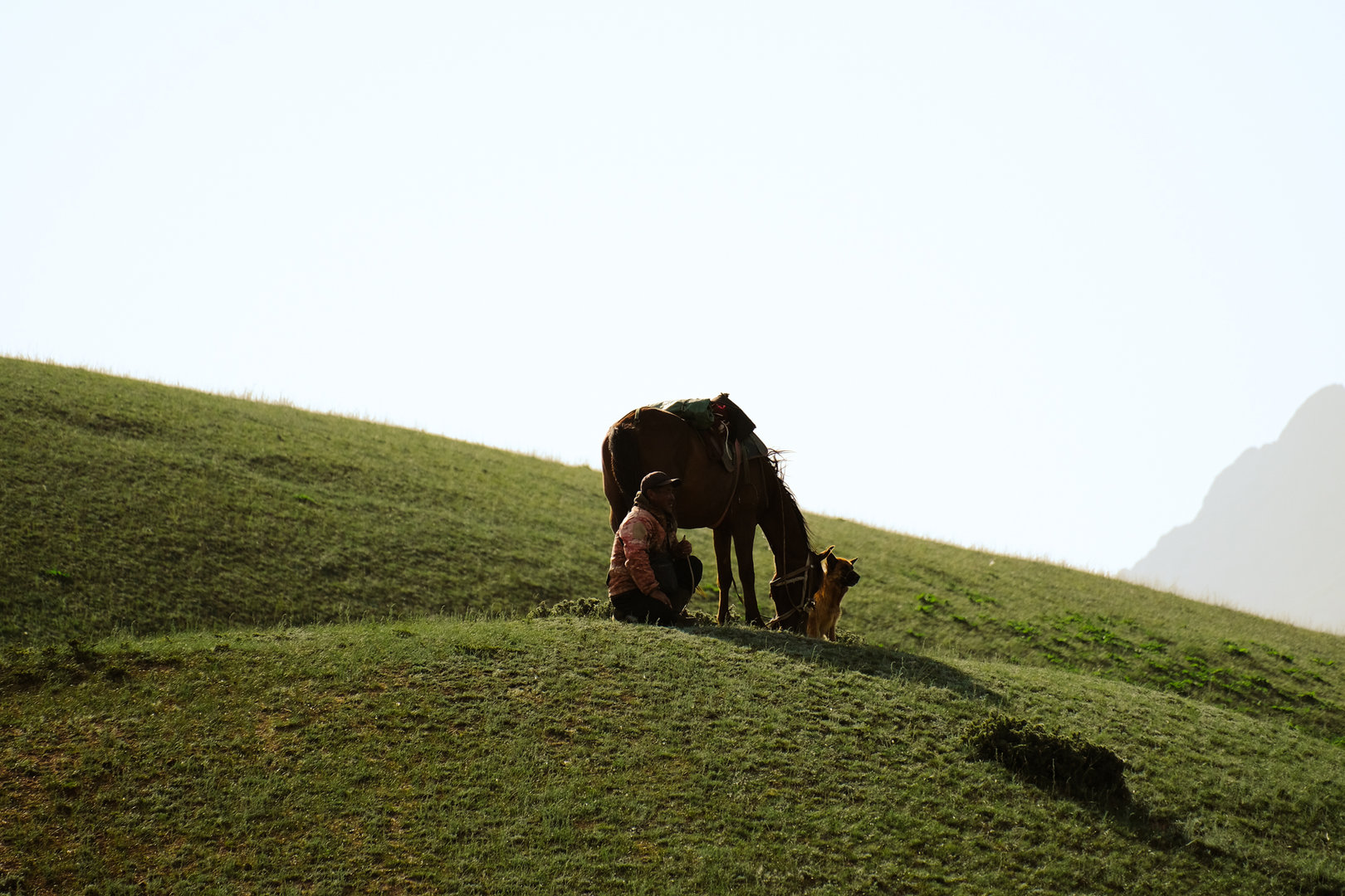 Au loin, un troupeau de brebis arrive. Un berger à cheval et ses deux chiens viennent à notre rencontre. Il ne parle pas anglais mais Alix lui dit quelques mots de russe. Il s’appelle Pakt. Malgré la barrière de la langue, il reste à côté de nous dans le silence. De temps en temps, il sort une paire de jumelles et regarde au loin. Cherche t-il du bétail égaré ? ou un prédateur ?