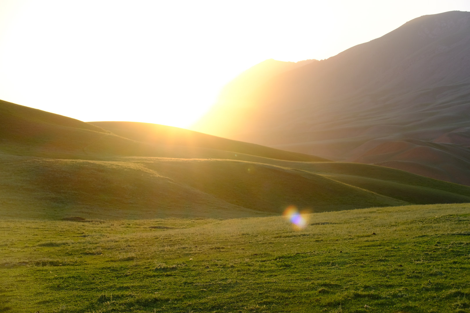Arrivés à Naryn, on commence la piste n°14 qui porte bien son nom. Dès les premiers kilomètres, on découvre de grandes collines vertes et marrons qui deviennent rougeoyantes au coucher du soleil. Nous prenons de la hauteur pour le bivouac.
