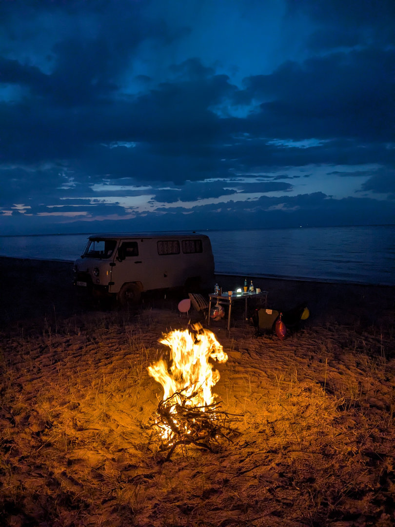 La soirée se termine par un magnifique coucher de soleil sur les montagnes. Nous allumons un feu et enchaînons les parties d’Uno sur la plage. Puis, d’un coup, le vent se lève. La pluie arrive, on se réfugie dans les véhicules. Le vent souffle fort dans la nuit.