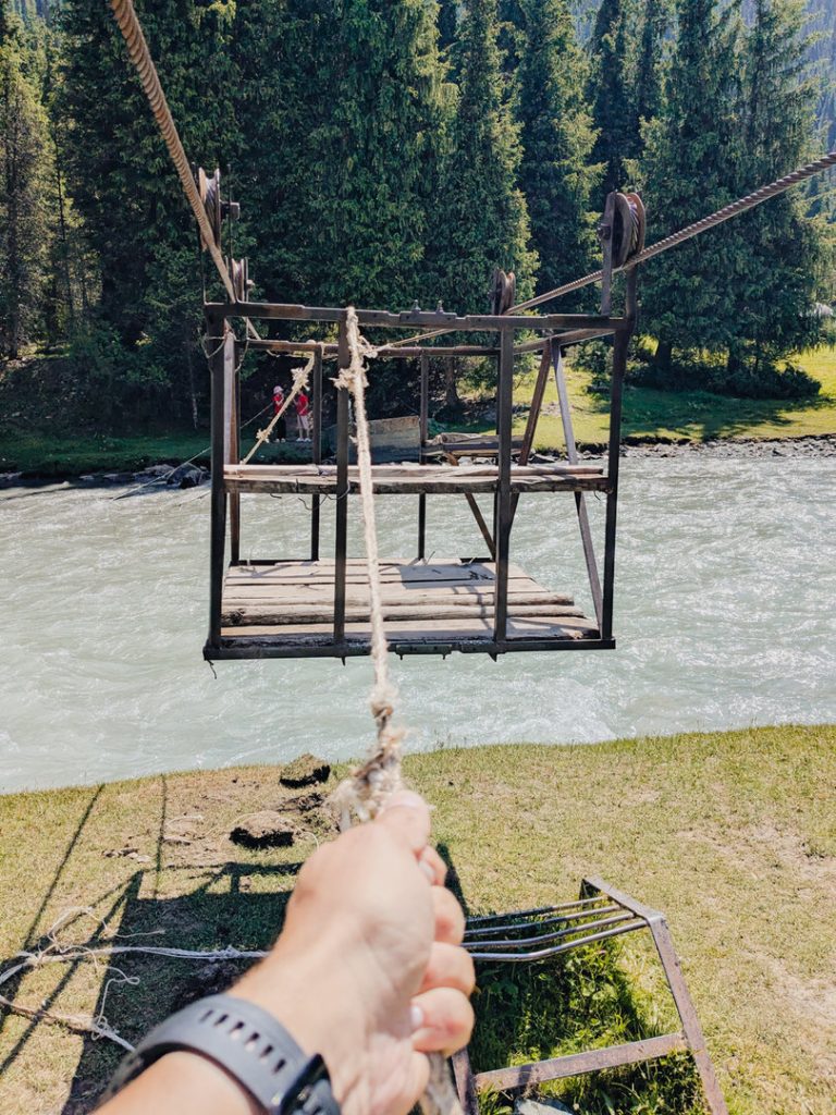 Ce matin, on reprend la piste avec un seul UAZ, direction une ancienne station météo russe perdue dans les hauteurs. On longe une rivière sur un terrain de plus en plus accidenté. La piste devient technique, avec des passages très costauds : de gros rochers, de petits gués à franchir et surtout des ponts dans un état plus que douteux ! Certains ponts sont à la limite du franchissable. Cramponnés aux fauteuils et concentrés, nous continuons de monter. Le dernier pont est compliqué, sur le passage de l’UAZ, les troncs se soulèvent et se déplacent découvrant le vide et la rivière en dessous. Comment allons-nous repartir ? Car la piste est en cul-de-sac.