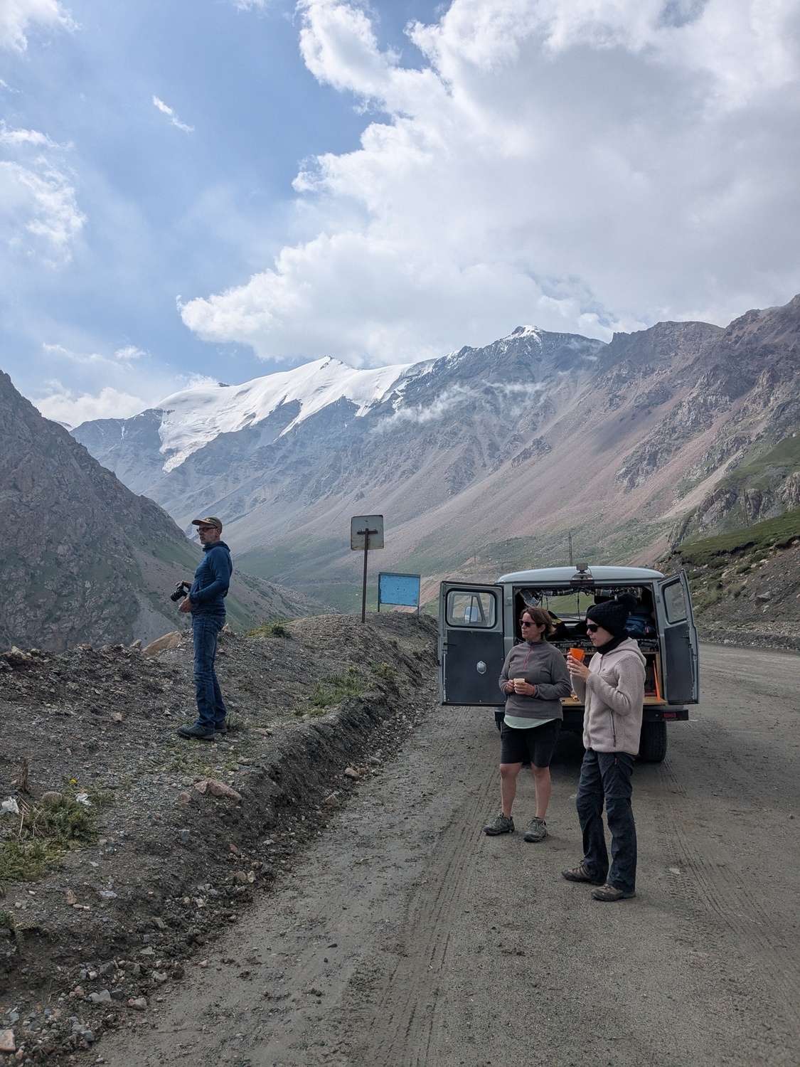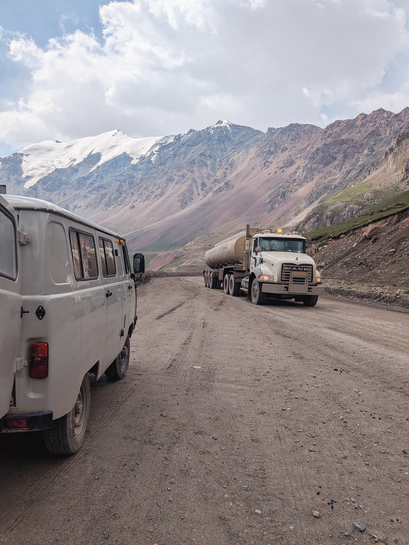 Réveil sous un grand soleil sur la plage du lac. L’ambiance a changé du tout au tout. On fait le plein d’essence et on achète du pain à 35 soms avant de s’élancer sur la piste n°7 vers Kumtor. La route grimpe en lacets jusqu’à 3100 m. Petite pause café au sommet, puis on poursuit vers l’ancienne mine d’or.