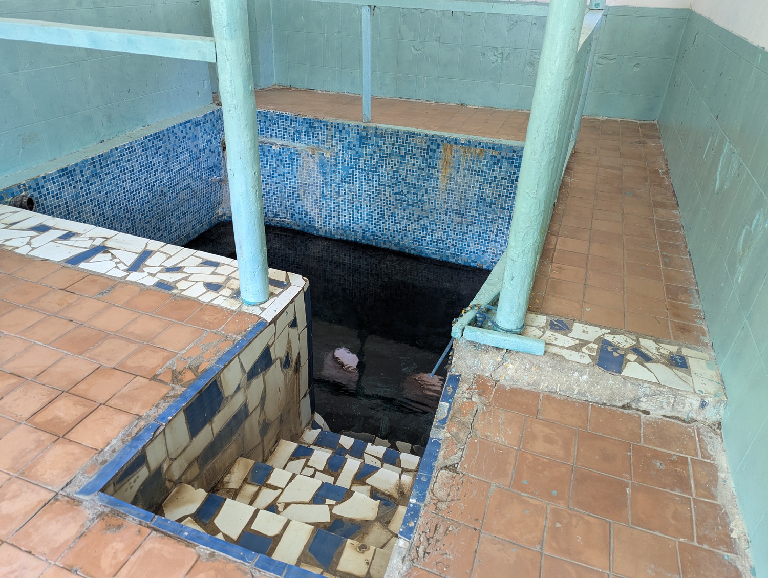 • Un bassin extérieur à 36°C. Visuellement, il fait sale. On voit des particules qui flottent et des résidus de produits comme de la crème solaire ou autre substance corporelle. Il faut faire abstraction…