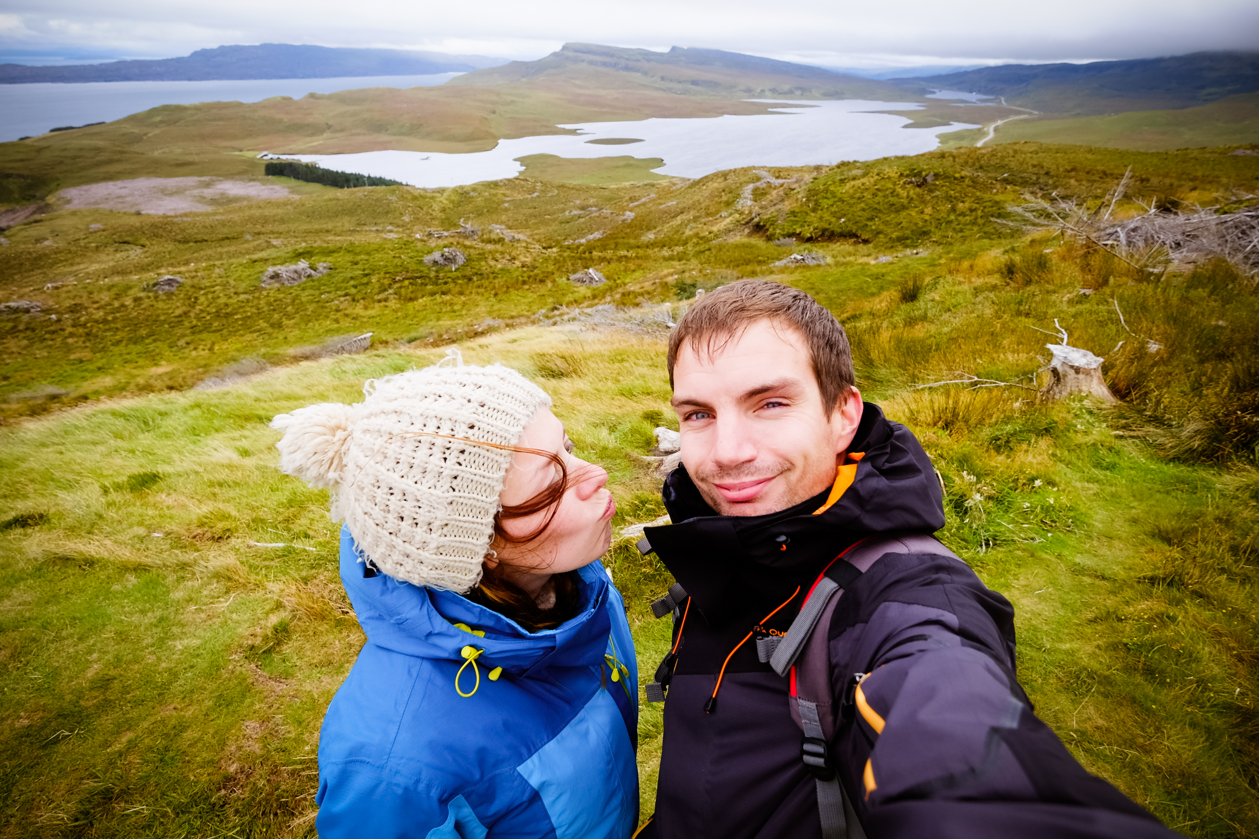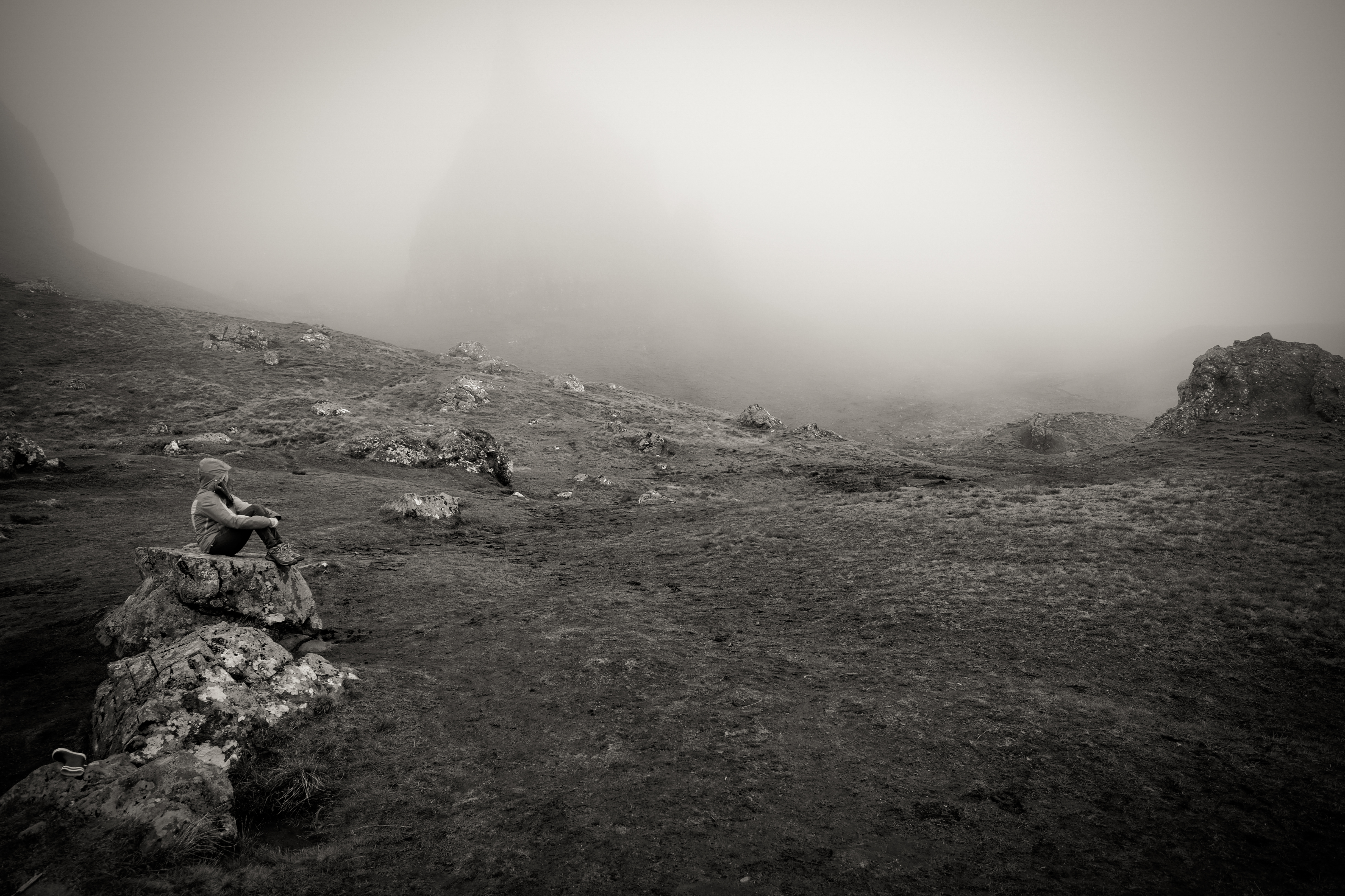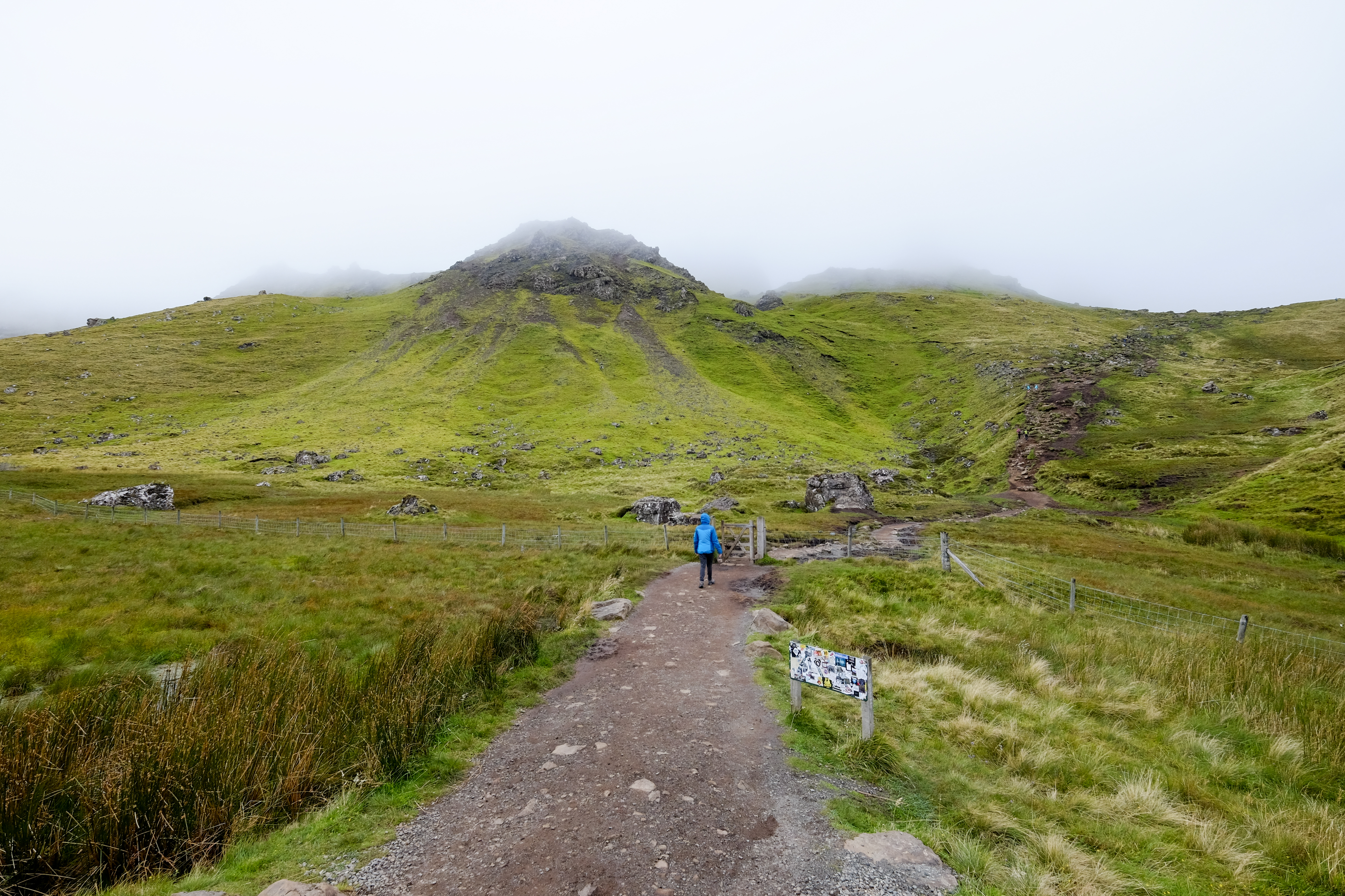 Notre premier stop est l’incontournable Old Man of Storr (pas le même que celui des Highlands dont les noms se ressemblent). La randonnée grimpe vite et haut. Nous n’avons pas de chance, il y a tellement de brume qu’on ne voit rien. Nous décidons de monter le plus haut possible mais plus nous avançons, plus le brouillard est dense.