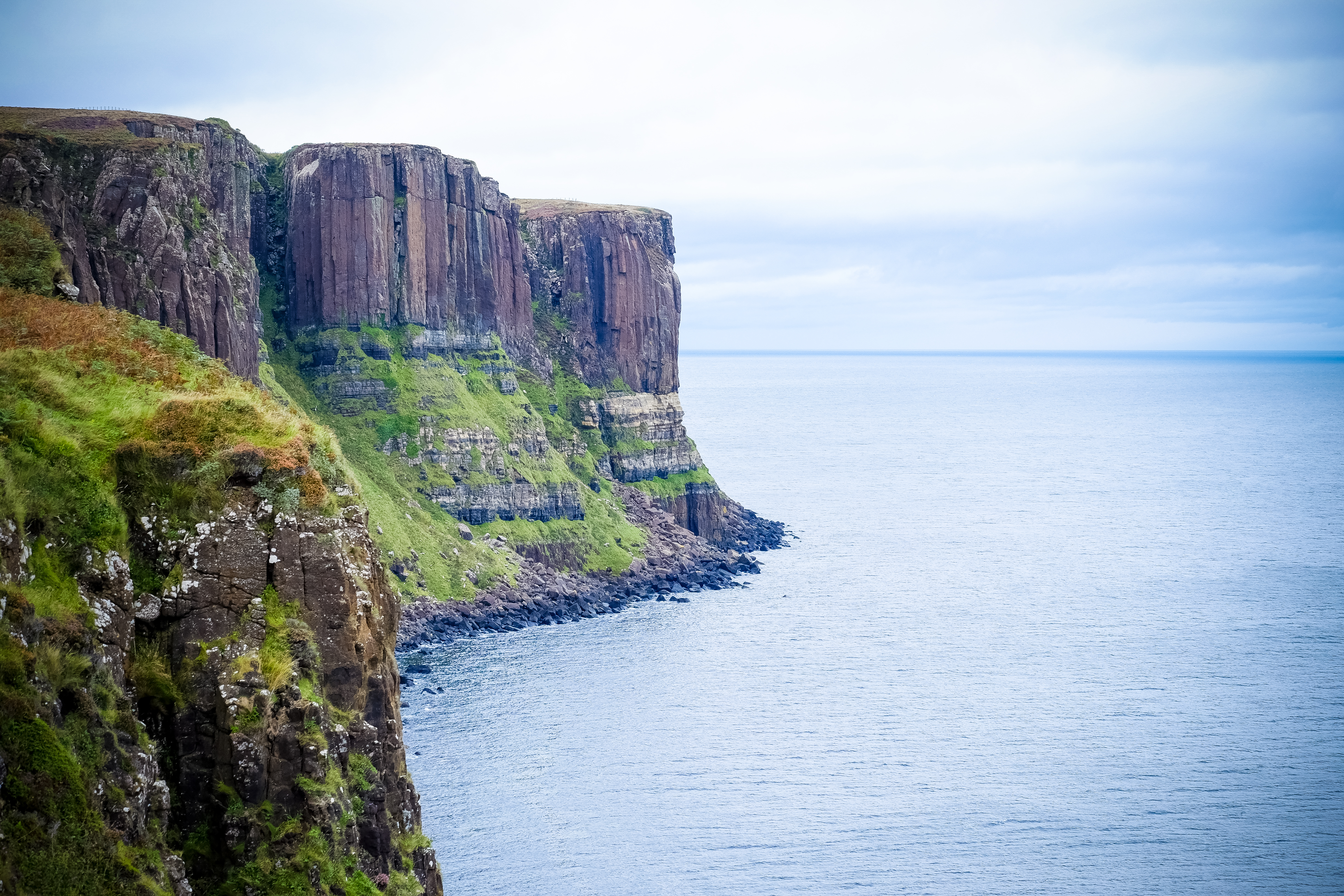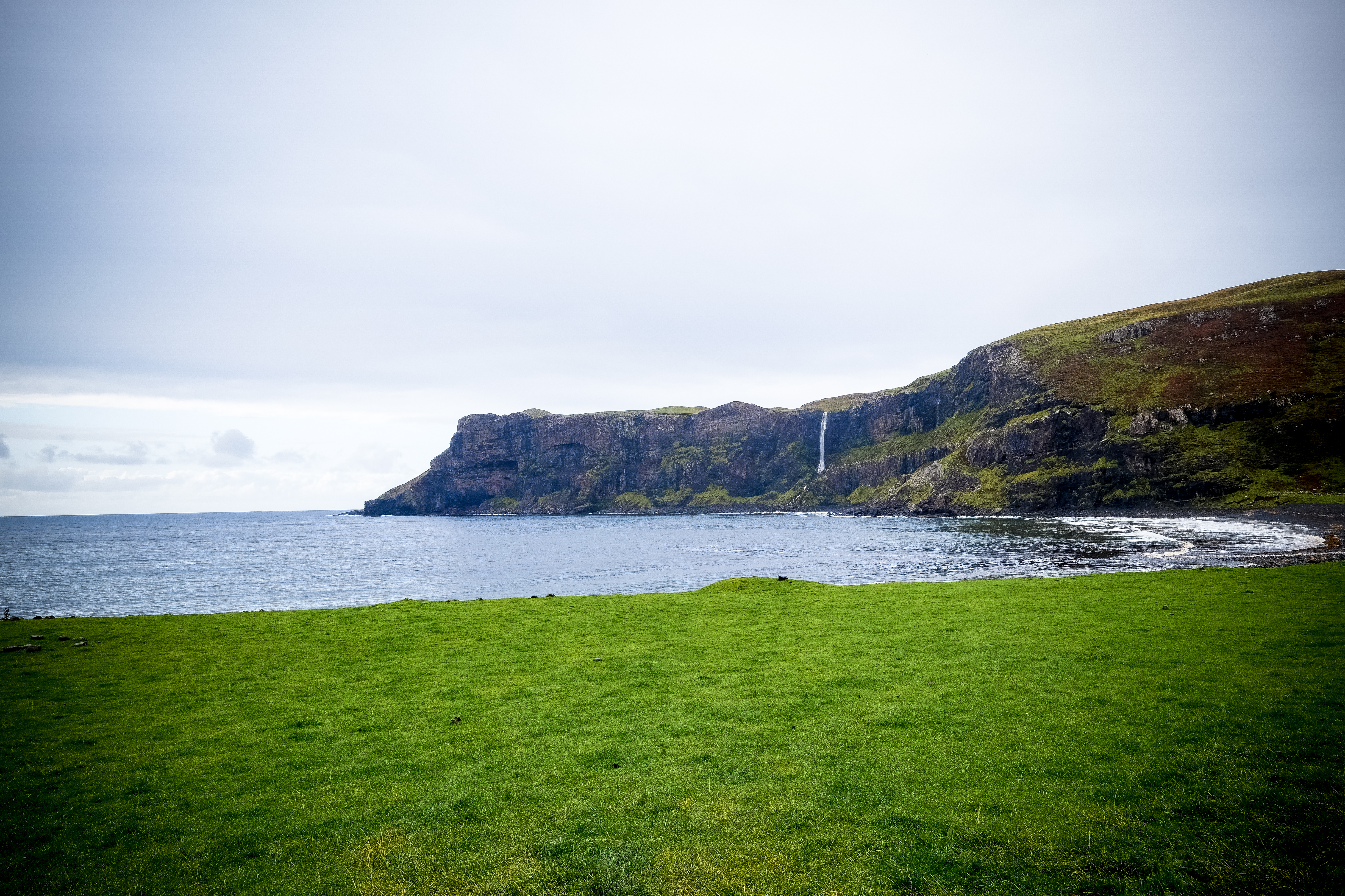 Face à cet échec, nous redescendons et nous continuons notre route. Un peu plus au nord, se trouve Kilt rock. Une belle cascade qui se jette dans la mer. De là haut, nous avons un beau point de vue sur les falaises de Skye et ses orgues basaltiques. Les paysages sont époustouflants. Un écossais joue de la cornemuse sur place, ça fait un peu attrape touriste mais ça donne une petite ambiance sympa aussi !
