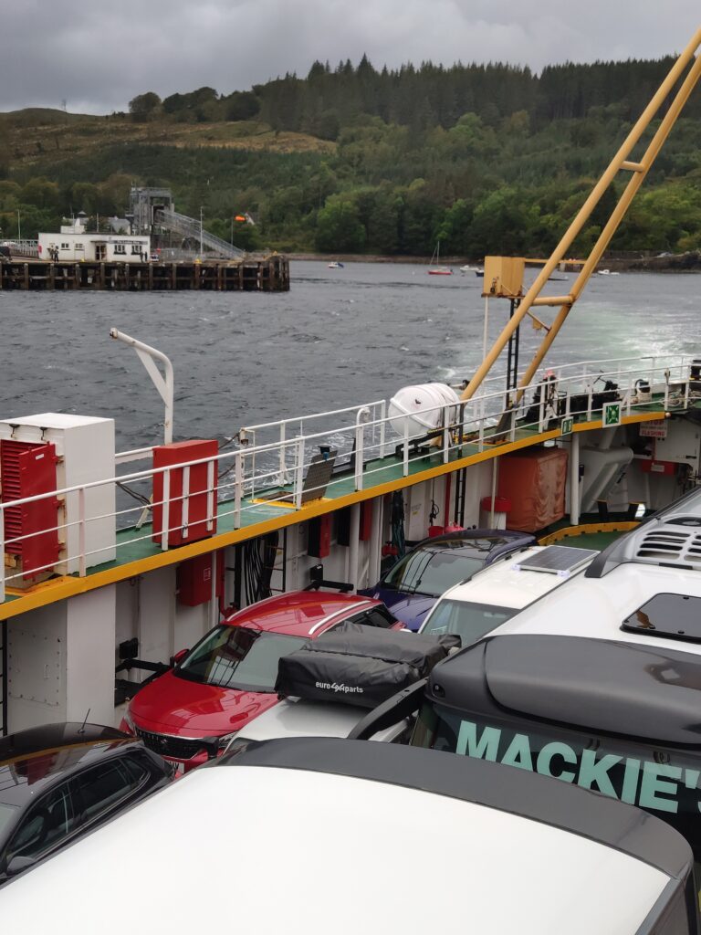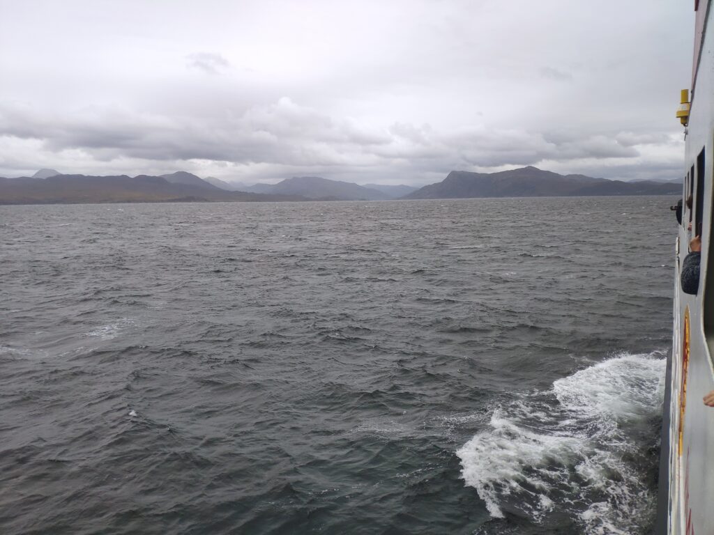 Après quelques courses et un pique-nique dans le parc de Kinloch, nous arrivons à la gare maritime d’Armadale. Nous avions déjà réservé notre ferry pour Mallaig pour le lendemain mais vu la vitesse de vent annoncée, nous savons que nous ne pourrons pas dormir sereinement en tente. Nous devons quitter l’île ce soir. Le personnel de la gare est très gentil et compréhensif mais les liaisons sont annulées les unes après les autres à cause du vent. Ils ne savent pas si un ferry partira aujourd’hui. Nous avons le choix : se faire rembourser et faire 200km de détour pour retrouver le continent ou attendre de voir si un ferry partira. Nous attendons donc l’heure du prochain départ. Finalement, après 1h d’attente, ils nous font signe, il y a de la place pour embarquer ! Le ferry est tout petit et embarque une quinzaine de véhicules environ. La traversée est très houleuse et heureusement ne dure que 30 minutes. Nous sommes contents (enfin surtout Alix) de retrouver la terre ferme.